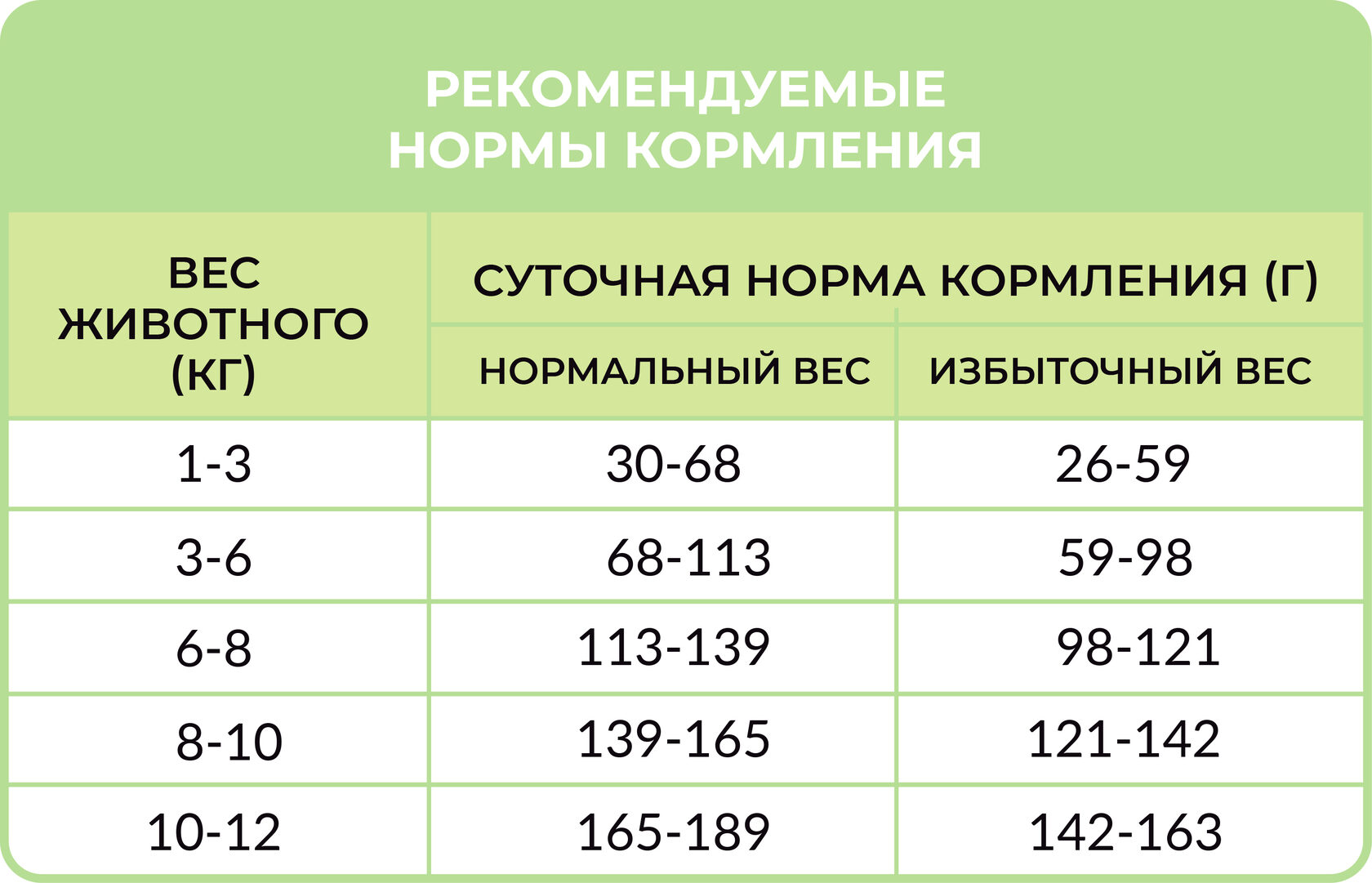 Рекомендуемое количество корма является ориентировочным и зависит от времени года, физической активности и индивидуальных особенностей животного.