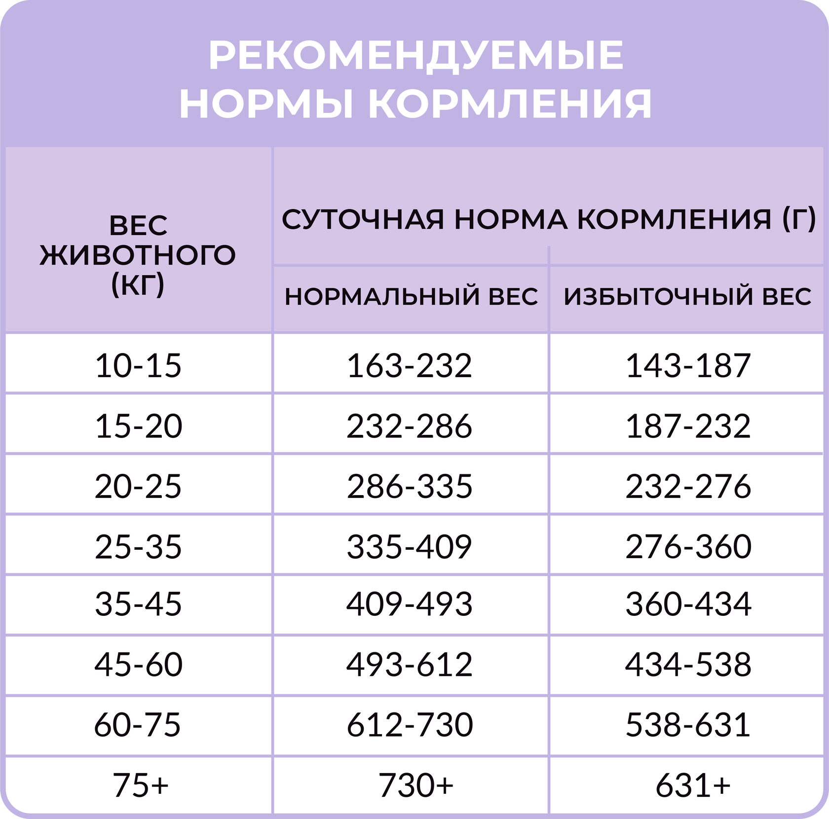 Рекомендуемое количество корма является ориентировочным и зависит от времени года, физической активности и индивидуальных особенностей животного.